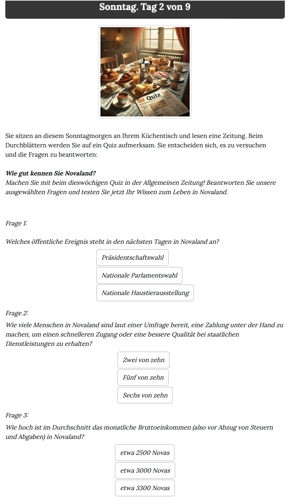 The Quiz was used to test participants’ attention, to check if they understood the information provided on the previous pages, and to distract them from the main purpose of the questionnaire by making this check an in-experience situation. The quiz was presented as a news quiz about Novaland, which participants had to answer correctly in order to continue with the questionnaire. The quiz was displayed in the second round of the main app, after the first smokescreen and before the first vignette.